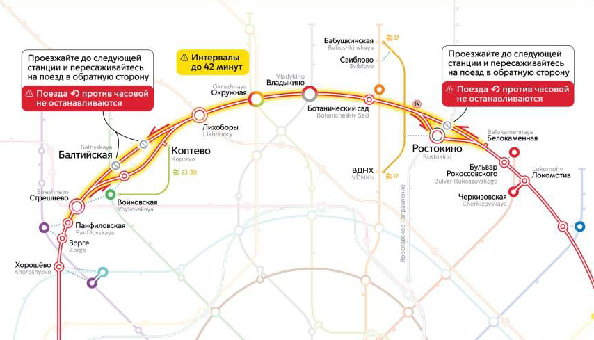 Интервалы движения между Панфиловской и Ростокино будут увеличены от 8 до 42 минут. Кроме того, поезда, двигающиеся с северо-запада против часовой стрелки, не будут останавливаться на станции Ростокино. Придётся ехать до следующей станции Белокаменная и пересаживаться на поезд в обратном направлении.